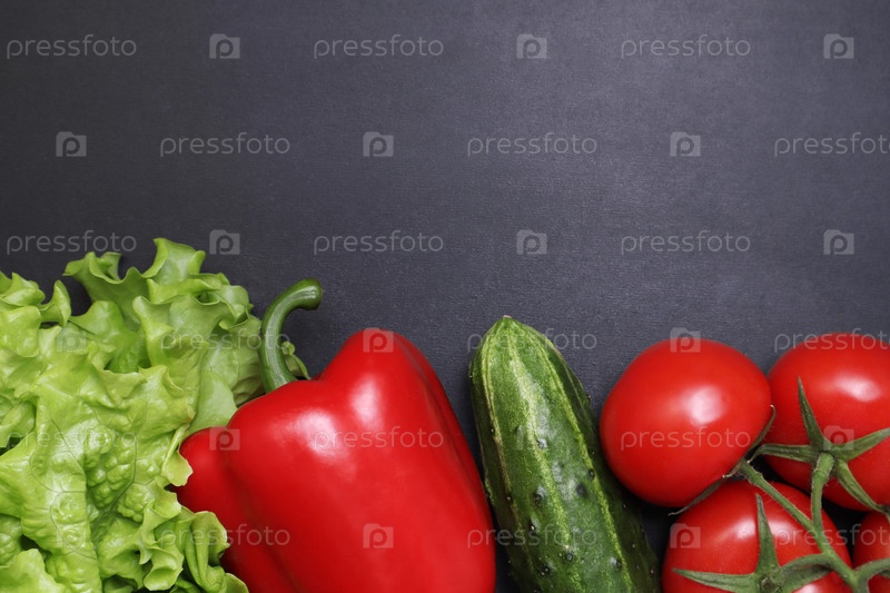 Зеленый салат, красные спелые помидоры на ветке, свежие огурцы и красный болгарский перец паприка. Овощи на черном текстурированном фоне