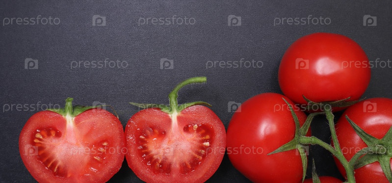 Красные спелые помидоры на ветке. Овощи на черном текстурированном фоне