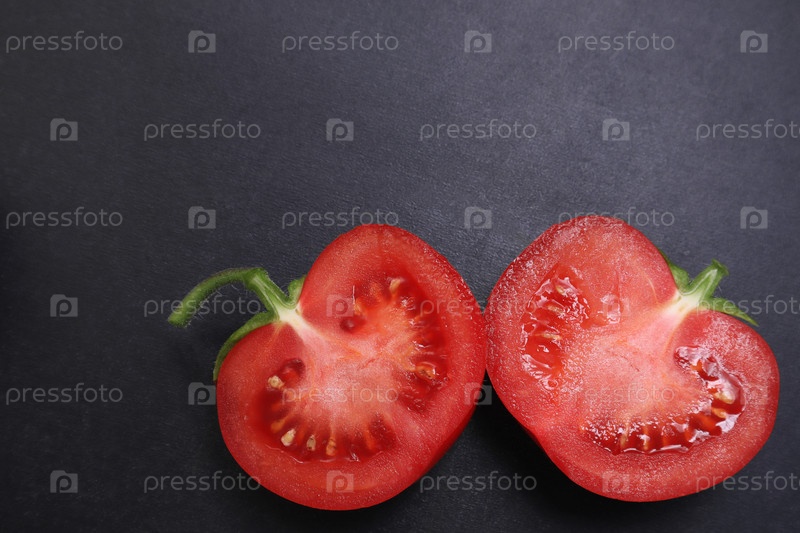 Красные спелые помидоры на ветке. Овощи на черном текстурированном фоне