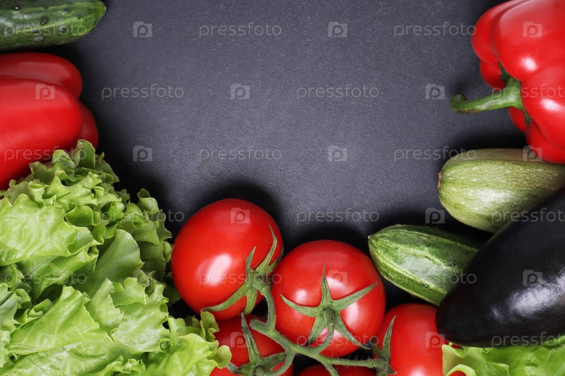 Зеленый салат, красные спелые помидоры на ветке, свежие огурцы и красный болгарский перец паприка. Овощи на черном текстурированном фоне