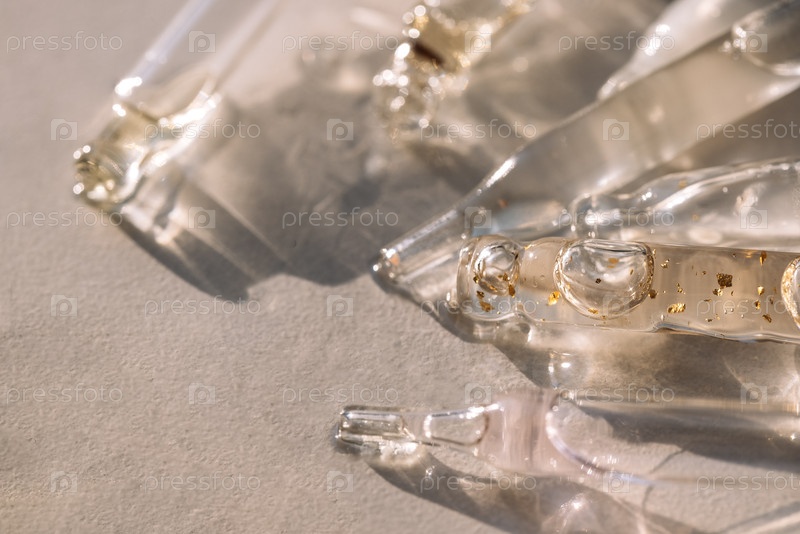 Крупный план стеклянных пипеток с увлажняющей сывороткой с коллоидным золотом. Пипетки с тонизирующей эссенцией для кожи лица с прозрачными каплями на белом фоне