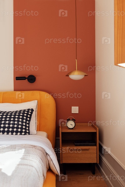Современная спальня с удобной кроватью и ярко-желтым изголовьем