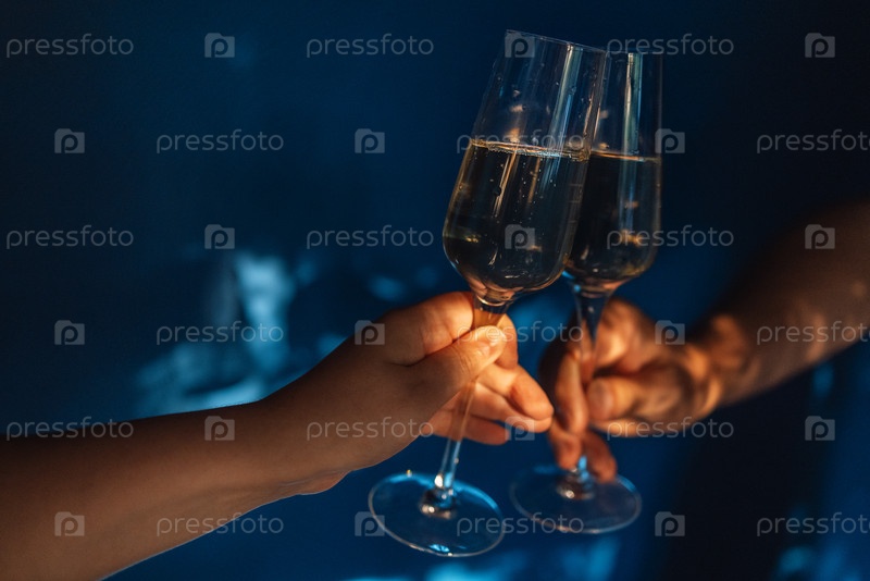 Мужские и женские руки держат бокалы с изысканным шампанским для тоста. Женщина и мужчина празднуют и чокаются бокалами с игристым вином