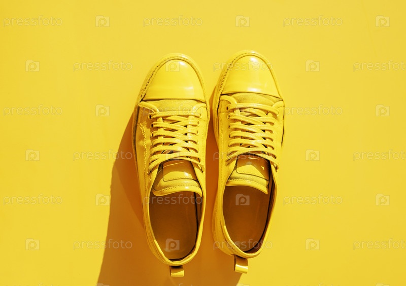 Желтые кроссовки на желтом изолированном фоне. Женские низкие кроссовки на ярком фоне. Вид сверху. Женская обувь