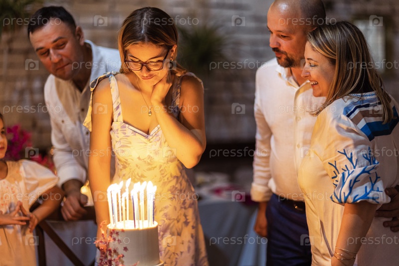 Молодая девушка загадывает желание и смотрит на праздничный торт. Милая девчонка в элегантном платье задувает свечи в свой день рождения