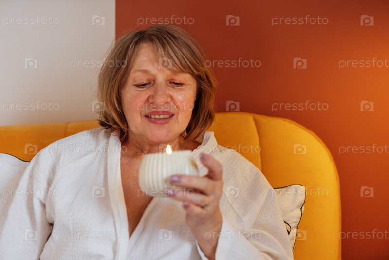 Пожилая женщина в белом халате лежит в постели и держит ароматическую свечу. Зрелая дама улыбается и расслабляется в спальне. Пенсионерка смотрит на пламя свечи и наслаждается запахом