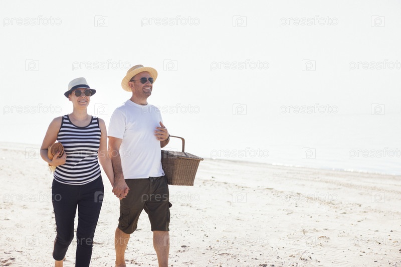 Супружеская пара отправляется на пикник у моря. Мужчина и его жена в повседневной одежде прогуливаются по песчаному пляжу. Улыбающаяся женщина и ее муж держатся за руки и веселятся вместе