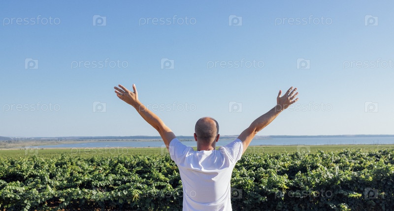 Молодой человек в белой футболке раскинул руки и смотрит на морское побережье. Мужчина средних лет стоит спиной и наслаждается природным пейзажем
