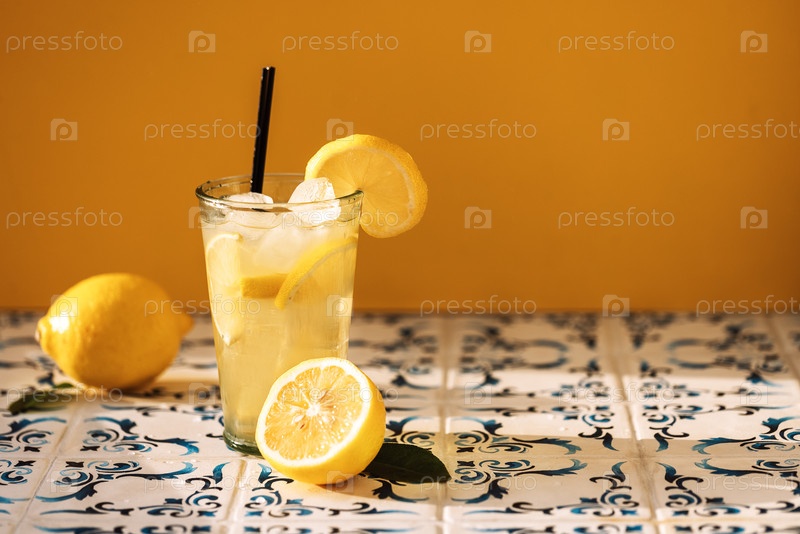 Крупный план стакана вкусного лимонада с кубиками льда на столе из белой плитки с синими узорами. Чашка прохладного цитрусового. Вкусный кислый напиток с лимонами
