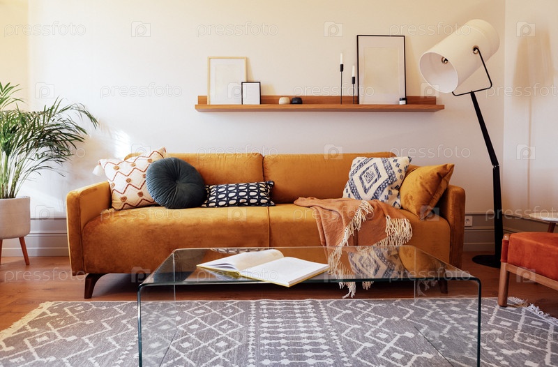 Стильный диван из оранжевой мягкой ткани с контрастными подушками и пледом. Современный стеклянный журнальный столик с открытой книгой. Элегантный торшер и горшок с комнатным растением
