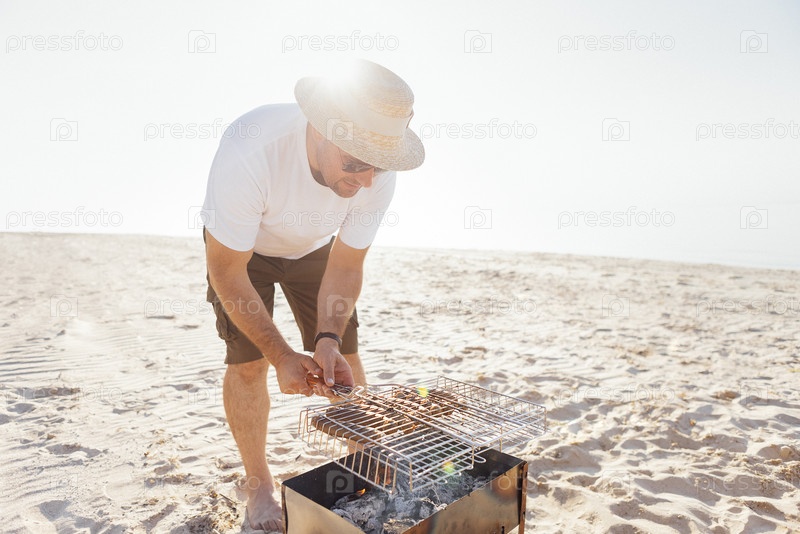 Молодой человек в летнем повседневном наряде жарит барбекю на песчаном пляже. Мужчина в солнцезащитных очках и соломенной шляпе жарит сосиски на берегу моря