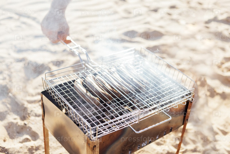 Крупный план мужской руки, держащей гриль с жареными сосисками. Гриль для барбекю на песчаном пляже. Мужчина жарит сосиски на открытом огне