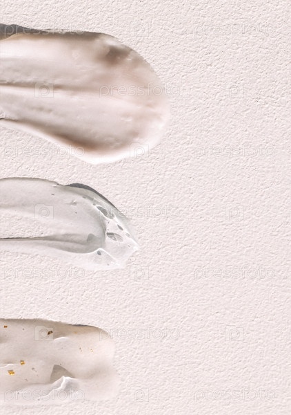 Разная текстура геля и крема на светлом фоне. Прозрачная сыворотка с пузырьками и коллоидным золотом. Консистенция глицеринового геля. Различные косметические кремовые мазки