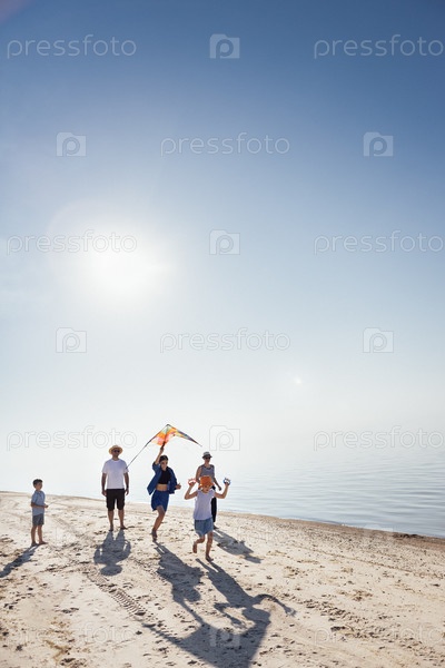 Большая счастливая семья запускает воздушного змея на берегу моря. Радостные дети и их смеющиеся родители веселятся на песчаном пляже