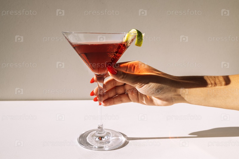 Крупный план бокала мартини и женской руки с красным маникюром. Женщина держит бокал с алкогольным напитком, украшенным цедрой лайма