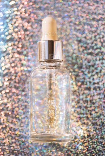 Крупный план прозрачного флакона увлажняющей сыворотки с пузырьками и пипеткой. Косметические продукты. Витаминная эссенция с пипеткой на голографическом серебристом блестящем фоне