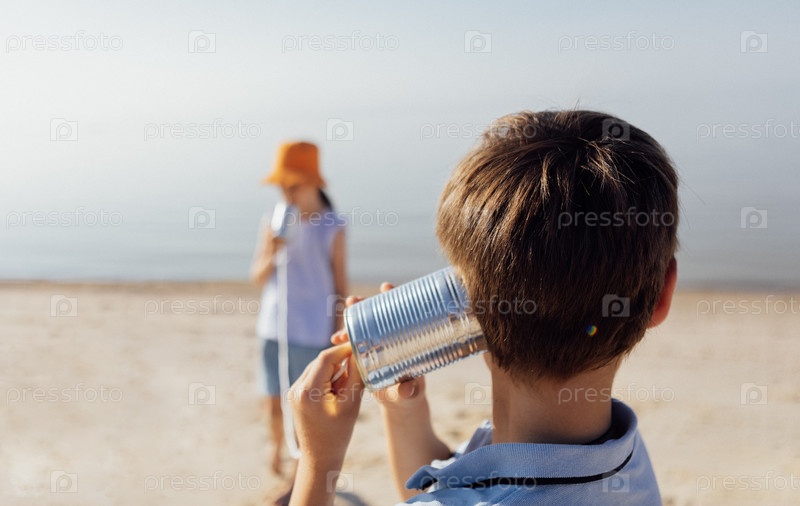 Маленькие дети в повседневной одежде играют у моря. Милые дети разговаривают по рации из жестяных банок. Мальчик и девочка болтают по телефону из банок и веселятся на пляже