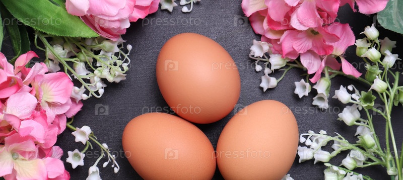 Пасхальные яйца среди весенних цветов на черном фактурном фоне