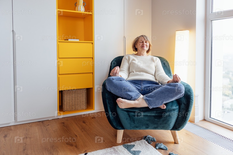 Пожилая женщина сидит в кресле в позе лотоса. Зрелая дама закрыла спортзал и медитирует в гостиной. Пенсионерка отдыхает дома