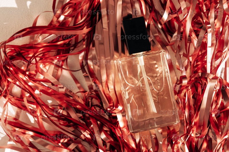 Крупный план прозрачного стеклянного флакона для духов с черной крышкой на блестящем красном фоне из металлизированного бумажного наполнителя. Флакон с ароматной водой на измельченной фольгированной бумаге