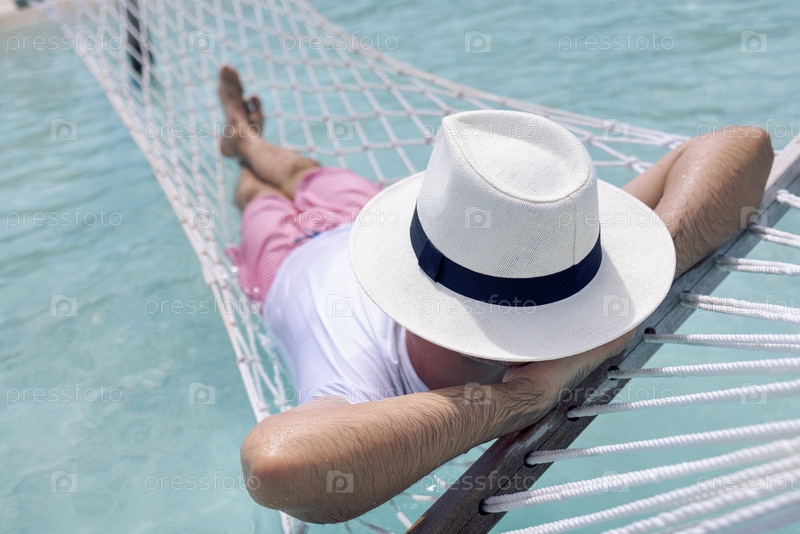 Молодой человек в летней одежде и шляпе лежит в гамаке в чистой морской воде