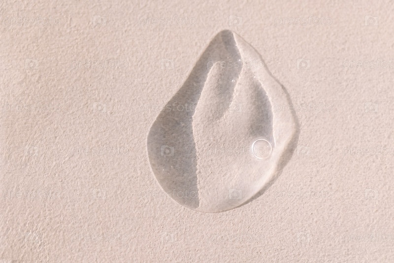 Крупный план прозрачного геля с пузырьками. Косметические продукты. Капля сыворотки или эссенции на текстурированном фоне. Яркий солнечный свет
