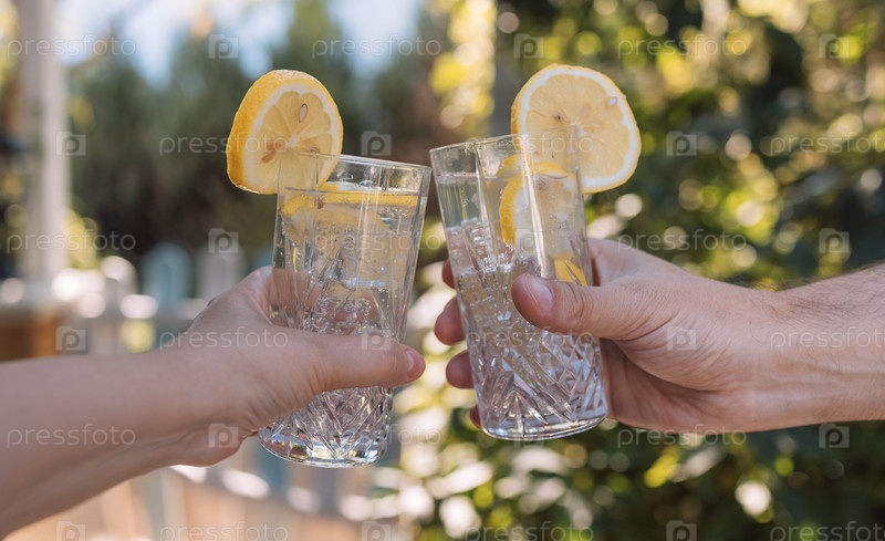 Мужские и женские руки чокаются бокалами с лимонадом и дольками лимона. Мужчина и женщина держат вкусные натуральные коктейли на открытом воздухе