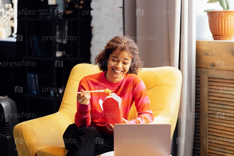 Милая африканская женщина в свитере сидит в желтом кресле и ест лапшу палочками. Улыбающаяся черная девушка смотрит фильм на своем ноутбуке