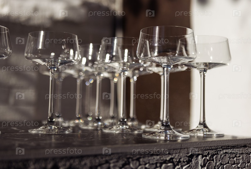 Пустые элегантные бокалы на длинной ножке на барной стойке. Роскошные бокалы на черном мраморном столе. Ожидание гостей на вечеринке