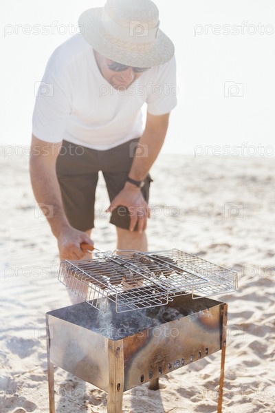 Молодой человек в летнем повседневном наряде готовит барбекю на песчаном пляже