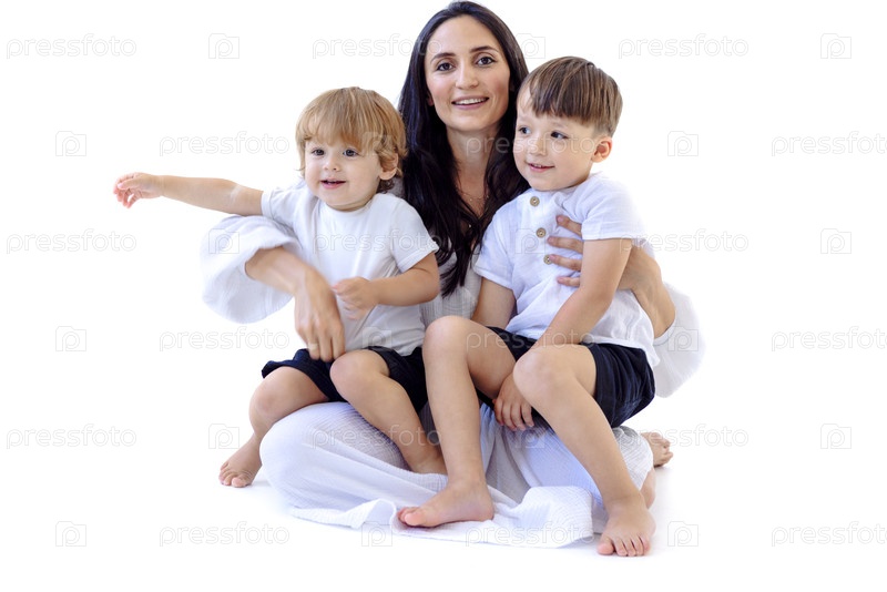 Молодая беременная женщина в белом платье со своими очаровательными сыновьями