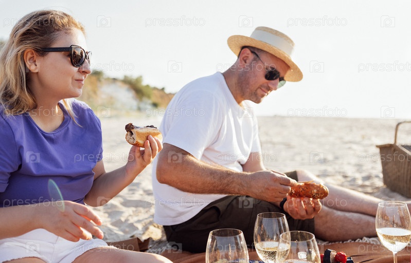 Улыбающиеся мужчина и женщина сидят у моря и устраивают пикник. Супружеская пара ест и веселится с друзьями на песчаном пляже