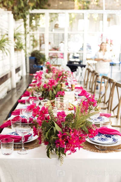 Накрытый праздничный стол на открытом воздухе. Стол украшен свечами и цветами