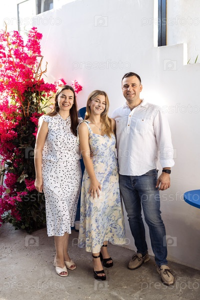 Симпатичная девочка-подросток и ее родители в нарядной одежде улыбаются и позируют