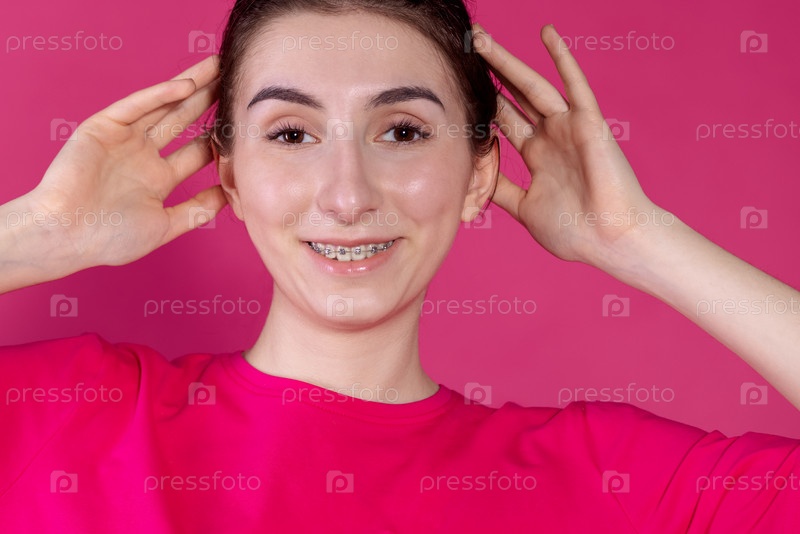 Портрет крупным планом молодой девушки, улыбающейся на розовом фоне. Милый подросток с брекетами смеется