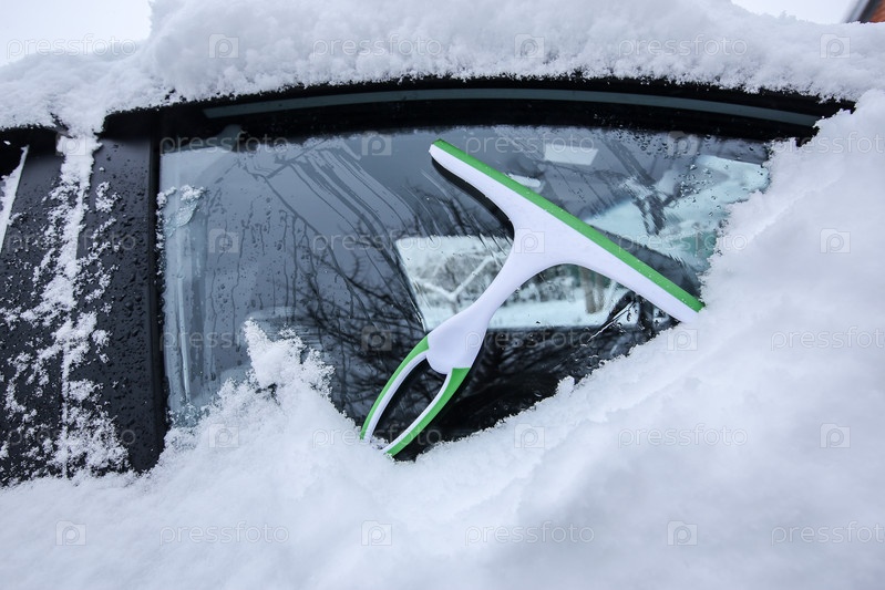Краснодар, Россия-26 декабря 2018. Очистка автомобиля от снега пластиковым скребком. Экстремальный снегопад в европейском городе
