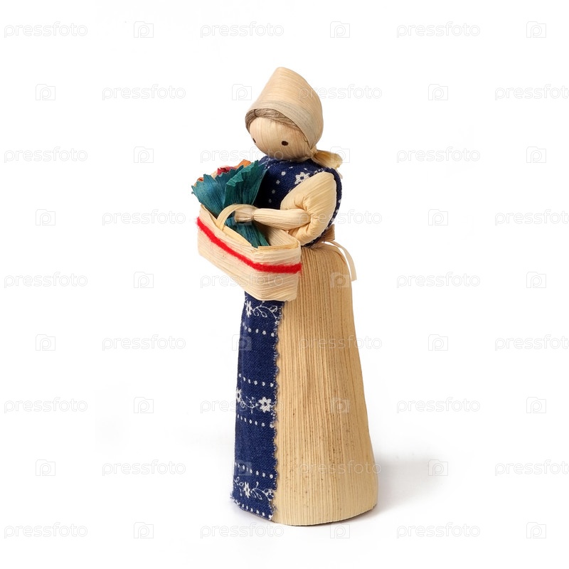 Соломенная сувенирная кукла в национальном костюме, изолированная на белом фоне
