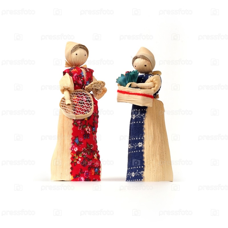 Соломенные сувенирные куклы в национальных костюмах, изолированные на белом фоне