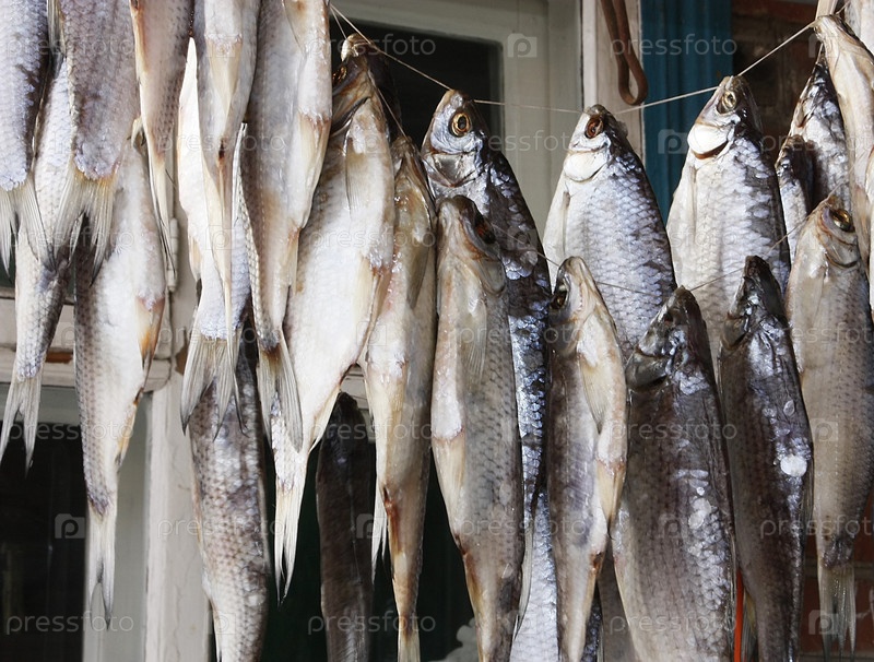 Сушеная рыба висит на веревке
