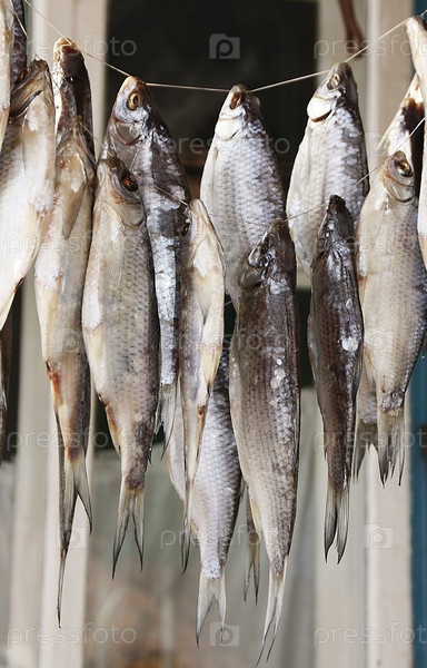 Сушеная рыба висит на веревке