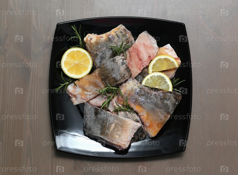 Кусочки замороженной рыбы на блюде с лимоном и розмарином