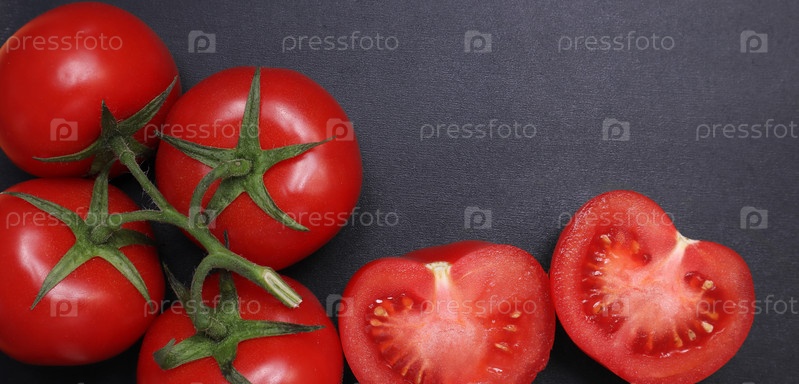 Красные спелые помидоры на ветке. Овощи на черном текстурированном фоне