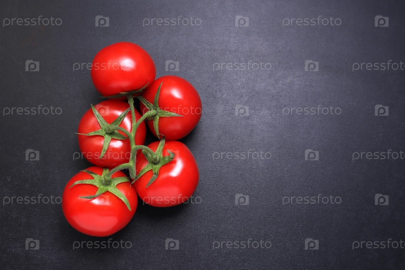 Красные спелые помидоры на ветке. Овощи на черном текстурированном фоне