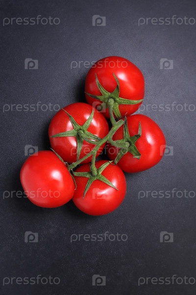 Красные спелые помидоры на ветке. Овощи на черном текстурированном фоне
