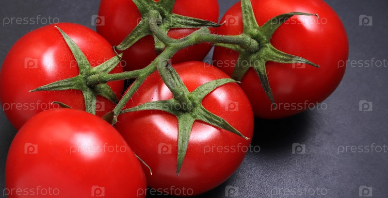 Красные спелые помидоры на ветке. Овощи на черном текстурированном фоне