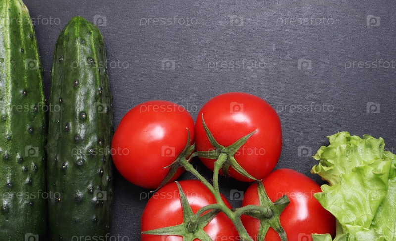 Свежие зеленые огурцы и красные спелые помидоры. Овощи на черном текстурированном фоне