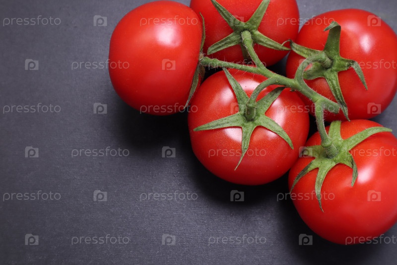 Красные спелые помидоры на ветке. Овощи на черном текстурированном фоне