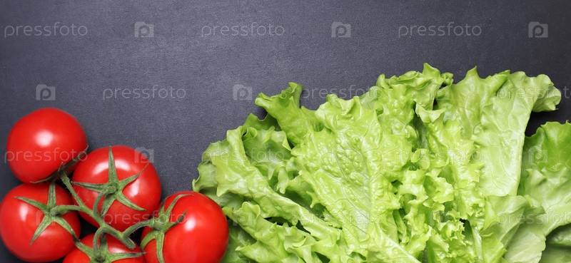 Зеленый салат листья красные спелые помидоры на ветке. Овощи на черном текстурированном фоне