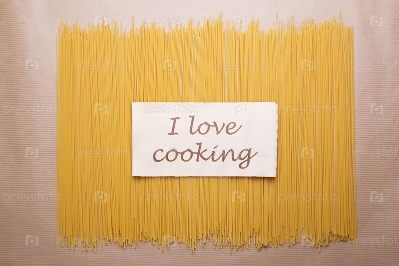 Спагетти. Итальянская паста. Фон с надписью «Я ЛЮБЛЮ ГОТОВИТЬ»