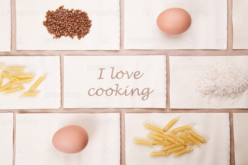 Диетическое питание. Набор диетических продуктов на крафтовом фоне с надписью Я ЛЮБЛЮ ГОТОВИТЬ